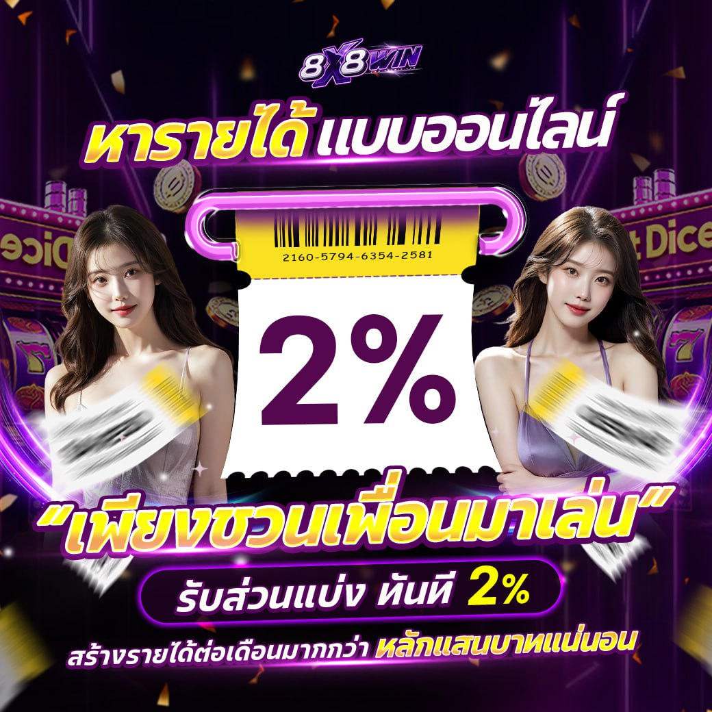 หารายได้แบบออนไลน์ แนะนำเพื่อนมาเล่นเว็บ 8X8WIN รับค่าคอมมิชชั่น 2% ทุกยอดเล่นของเพื่อน ตลอดชีพ!!